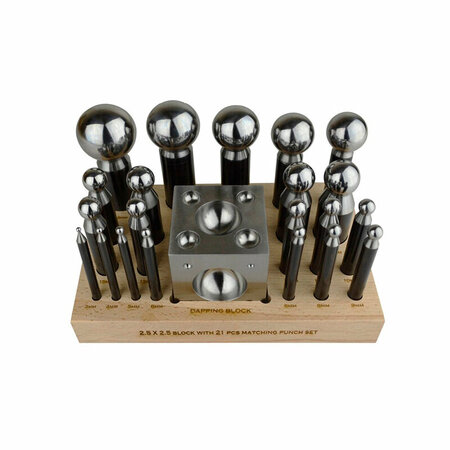 Анки и пунзеля применяются для сгибания, придания вогнутых / выпуклых форм, для бухтировки, для выколотки полусфер и создания пустотелых шаров из листового металла. Набор: унзеля 21 шт, размер от Ф3 до 43 мм. Анка куб 60x60 мм, имеет 21 углубление размером от Ф4 до 45 мм изготовлена из стали. Твердость - HRC 50.55 Инструмент предназначен для работы с мягкими металлами и сплавами. Подставка выполнена из бука с нанесением маркировки.