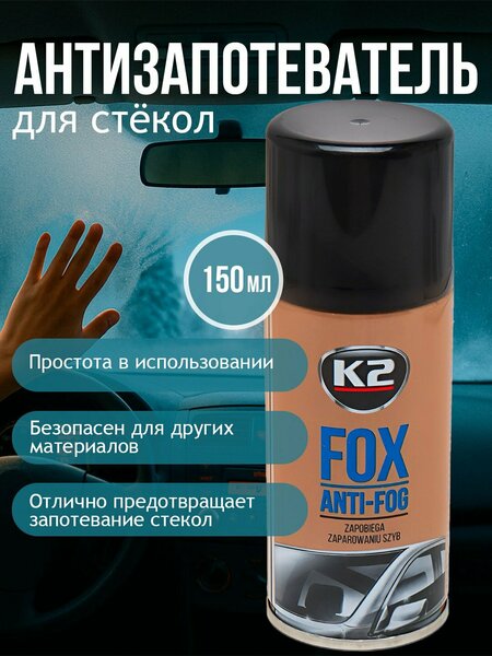 Антизапотеватель K2 FOX-отличное средство для защиты стекол и зеркала заднего вида от запотевания. Уменьшает сбор влаги и устраняет ограничение поля зрения водителя, повышая безопасность вождения. K2 FOX очень прост в использовании. Просто нанесите его на микрофибру или мягкую ткань, затем нанесите на стекло и протрите после высыхания. Антизапотеватель для стекол K2 FOX выпускается в виде аэрозоля, что позволяет эффективно использовать и предотвращать запотевание стекол в автомобиле до нескольких недель. Средство от запотевания стекла создает защитный слой, который предотвращает попадание влаги на стекло и оставляет его прозрачным. Благодаря K2 FOX чрезмерное испарение стекол в машине, уйдет в небытие. Вы избежите постоянного кропотливого протирания запотевших стекол, а само вождение автомобиля будет более безопасным и комфортным для вас и ваших пассажиров. Чтобы избавиться от лишней влаги в автомобиле, стоит также оснастить себя поглотителем влаги CARDOS, что также повлияет на комфорт путешествия и продлит действие Антизапотевателя. Особенности продукта: простота в использовании; безопасен для других материалов; эффективный; отлично предотвращает запотевание стекол. Инструкция для применения: Очистите стекло с помощью очистителя для стёкол K2 NUTA и микрофибры K2 OPTIНа чистое и сухое стекло с растояния 20-30см нанесите K2 FOX, стараясь максимально покрыть поверхность стеклаНе дожидаясь высыхания, располируйте круговыми движениями, используя микрофибру или мягкую хлопчатобумажную тканьзапрещается использование искусственных замш, типа дельфин для нанесения и располировки состава Срок годности указан на упаковке.