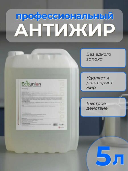 Профессиональное концентрированное средство антижир для кухни Ecounion 5 литров – незаменимый помощник для дома и бытовой уборки. Мощная формула быстро и эффективно удаляет жир, нагара, остатки пищи и другие загрязнения с плит, духовок, вытяжек, рабочих зон и любых твердых моющихся поверхностей. Этот жироудалитель легко справляется с самыми стойкими загрязнениями, обеспечивая чистку без лишних усилий. Для интенсивной очистки нанесите средство равномерным слоем, оставьте на 10–20 минут и смойте водой. Для регулярной уборки разведите 1 колпачок в 5 литрах воды, обработайте поверхность и протрите чистой влажной тканью. Перед использованием рекомендуется проверить на небольшом участке. Моющее средство для кухни подходит для всех твердых поверхностей и гарантирует эффективную чистку плит, духовок и вытяжек, облегчая ежедневную уборку дома. С Ecounion ваша кухня всегда будет блестеть, а бытовая химия станет надежным помощником в борьбе с жиром. Идеально для удаления загрязнений, нагара и остатков пищи, это средство 5 литров сочетает высокую эффективность и удобство в использовании.