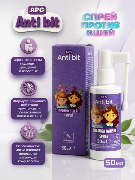 APG Anti-Bit – эффективное средство против вшей и гнид. Уничтожает паразитов и их яйца, облегчает вычёсывание, предотвращает повторное заражение. Подходит детям и взрослым, не содержит агрессивных химических веществ, имеет приятный аромат. Полное описание APG Anti-Bit – современный противопедикулёзный спрей, разработанный для безопасного удаления вшей и гнид. Активные компоненты (диметикон и минеральные масла) парализуют паразитов и высушивают их яйца, не вредя коже головы. Формула прошла дерматологические испытания и рекомендована для использования у детей. Регулярное применение обеспечивает чистоту волос, предотвращает повторное заражение и придаёт волосам свежий запах. Назначение и особенности ✔ Уничтожает вшей и гнид ✔ Безопасен для детей ✔ Предотвращает повторное заражение ✔ Приятный аромат ✔ Не содержит инсектицидов Инструкция по применению 1 Нанести спрей на сухие волосы от корней до кончиков. 2 Оставить на 15–20 минут. 3 Смыть тёплой водой и вичесать волосы гребнем. 4 При необходимости повторить через 7–10 дней. Избегать попадания в глаза и рот.