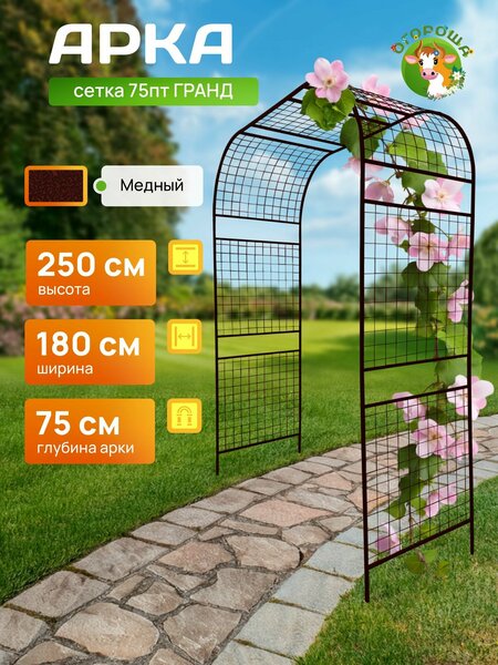 Арка садовая "Сетка 75ПТ Гранд антик" высота - 260, ширина - 180, глубина - 75. Арка садовая - это идеальное решение для создания уютного и стильного уголка в вашем саду. Сочетание зеленого цвета и металлической конструкции делает эту арку не только эстетически привлекательной, но и прочной. Особенностью этой садовой арки является ее специальное предназначение - она идеально подходит для вьющихся растений. Благодаря своей конструкции, арка обеспечивает опору для плетистых роз, винограда и других растений, которые нуждаются в поддержке. Прочный металл, из которого изготовлена эта арка, гарантирует ее долговечность и надежность. Двуслойная покраска обеспечивает защиту от коррозии и сохраняет яркость и красоту цвета на протяжении долгих лет. Высота арки позволяет создать величественный и элегантный образ. Она станет настоящим украшением вашего сада и привлечет внимание всех гостей. Арка садовая - это не только функциональное решение, но и элемент декора. Она придаст вашему саду особый шарм и уют. Создайте романтическую атмосферу, устроив уютный уголок для отдыха под плетистой розой. Закажите арку садовую прямо сейчас и превратите свой сад в настоящий райский уголок. Наслаждайтесь красотой и уютом, который создаст эта арка садовая.