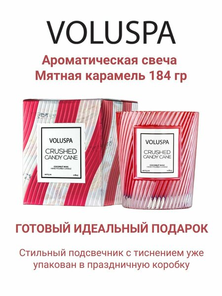 Свеча заливается вручную, подсвечник с узором Crushed Candy Cane и красивая подарочная коробочка. После использования подсвечник можно использовать, как стильный сувенир. Размеры свечи: