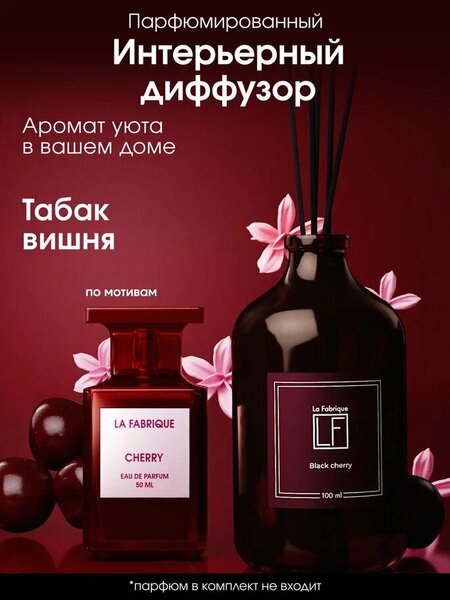 Создайте уютную атмосферу в вашем доме с ароматическим диффузором от La Fabrique. Диффузор с ароматом Black Cherry от бренда La Fabrique — это не просто ароматизатор, а целое искусство создания атмосферы уюта и комфорта. Этот диффузор станет замечательным акцентом интерьера и источником наслаждения для всех, кто ищет уютные моменты в повседневной жизни. В композиции аромадиффузора доминируют древесной коры, гвоздики, сандала и табака (табачного листа). Затем пирамида аромата раскрывается запахом спелой вишни, сладкого шоколада и цветущей сакуры. А микс из пряностей и ликер с черной вишней удачно завершают пирамиду своим благоухающим послевкусием. В составе наполнителя содержатся экологически чистые компоненты, в числе которых премиальные аромамасла из Франции. Натуральный состав аромапалочек способствует сохранению стойкости парфюма. Благодаря этому, он прослужит вам в среднем шесть месяцев. В комплекте 5 фибровых ароматических палочек. Благодаря стильному дизайну упаковки, этот аромат также станет замечательным подарком на Новый год, День Рождения, 8 марта, 14 февраля и другой праздник для ваших близких, подчеркивая их индивидуальность и вкус. Позвольте насладиться этим чудесным ароматом, который наполнит ваши мгновения особым смыслом. Нежность ванили и сила табака создают уникальное сочетание, которое с легкостью привлекает и удерживает внимание, заполняя пространство вокруг теплом и гармонией. Преобразите свой дом с La Fabrique — добавьте атмосферу комфорта и тепла в каждый уголок. Идеально подходит в качестве подарка для близких!