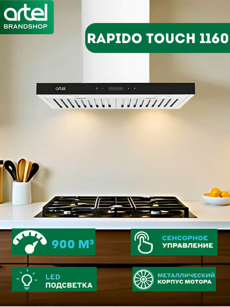 ытяжка Artel Art-1160-IN L Rapido Touch поразит Вас своим невероятно низким уровнем шума. Кроме того, она оснащена анти-возвратным клапаном, который эффективно предотвращает попадание неприятных запахов с улицы. Важно отметить, что в устройстве установлен специальный фильтр BAFFLE, который отличается высокой надежностью и долговечностью в плане улавливания жира. Алюминиевый фильтр, используемый в этой модели, является экологически безопасным и обеспечивает высококачественную очистку воздуха от неприятных запахов и частиц жира. Еще одним приятным дополнением дизайна является сенсорная панель управления, которая не только эстетически привлекательна, но и очень удобна в использовании. И, конечно же, удобная LED-лампа обеспечит Вам дополнительное удобство при работе в условиях низкой освещенности.