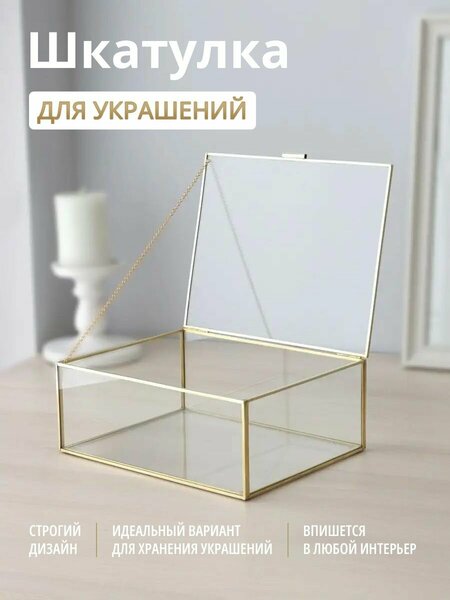 Размеры25х20х10см. Шкатулка из прозрачного стекла и латуни, под "золото" при открывании крышка фиксируется на цепочке. Современный и лаконичный стиль. Модная деталь интерьера. В этой шкатулке можно хранить абсолютно разные вещи: бижутерию, очки, часы и еще кучу разных мелочей. Уход: Можно мыть водой с применением пенящихся средств для мытья посуды и стекла. Протирать насухо мягкой тканью упаковка: транспортировочная коробка из гофрокартона.- - При получении продукции из стекла в ПВЗ или у курьера проверяйте все стеклянные изделия на целостность.- Изделие не должно быть со сколами, трещинами, царапинами или разбито. В противном случае претензии на возврат приниматься не будут.