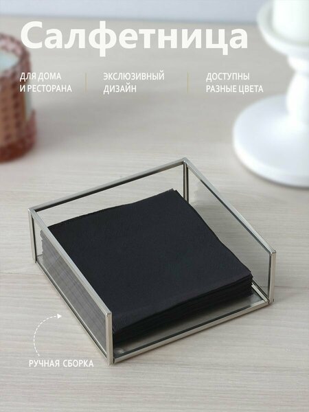 Размер 13,5х13,5х5,5см. Салфетница под маленькие салфетки 12х12см. Стекло, серебристый профиль, ручная сборка. Вам нужна удобная уличная салфетница?-И он должен быть еще и очень стильный? У нас есть готовое решение. Этот модная салфетница мы специально разработали для вас. Он займет достойное место в интерьере и ваши салфетки не разлетятся! Салфетница из прозрачного бесцветного стекла и металлического профиля. уход: Можно мыть водой с применением пенящихся средств для мытья посуды и стекол. Протирать насухо мягкой тканью упаковка: транспортировочная коробка из гофрокартона. При получении продукции из стекла в ПВЗ или у курьера проверяйте все стеклянные изделия на целостность. Изделие не должно быть со сколами, трещинами, царапинами или разбито. В противном случае претензии на возврат приниматься не будут.