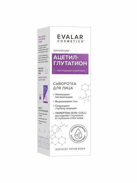 Внешний вид и свойства: имеет нежную консистенцию, легко и равномерно наносится на кожу лица, быстро впитывается, не оставляя жирного блеска. Сыворотка для лица «Ацетил-глутатион» - первая в России сыворотка с ацетил-глутатионом. Благодаря инновационному составу, сыворотка способствует видимому омоложению кожи, уменьшению пигментации, выравниванию и улучшению тона кожи; напитывает ее влагой и возвращает упругость и эластичность; сокращает морщины и препятствует появлению новых. Рекомендовано косметологами центра эстетической медицины и экспертизы (Москва) КАК работают ингредиенты? L-глутатион - мощный антиоксидант, нейтрализует свободные радикалы, Глутатион является природным компонентом, устраняющим пигментные пятна, отбеливая и осветляя кожу, за счет подавления активности тирозиназы и выработки меланина. S-ацетил-L-глутатион. Проникая непосредственно в клетки кожи, создает внутриклеточный запас глутатиона, препятствующий их старению. За счет антиоксидантного воздействия он восстанавливает ткани и защищает клетки от повреждения, позволяя сохранить красоту и здоровье кожи. Омолаживает, повышает упругость и эластичность кожи, разглаживает морщинки и снимает следы усталости, помогает коже вырабатывать витамин Е и С. Улучшает цвет лица и борется с угревой сыпью, устраняет возрастные пятна, гиперпигментацию и пост-акне. Пальмитоил трипептид-5 (Syn-Coll) - биоактивный трипептид сверхмалого размера, легко проникает в глубокие слои кожи и служит проводником для глутатиона и других активных компонентов сыворотки. Оказывает двойное действие: стимулирует синтез коллагена в коже и защищает волокна коллагена от разрушения. Улучшает структуру кожи и уменьшает морщины. Гиалуроновая кислота (гиалуронат натрия) - непревзойденный по увлажняющим свойствам компонент: каждая молекула притягивает и удерживает до 1800 молекул воды. В составе сыворотки обеспечивает как поверхностное, так и глубокое увлажнение кожи. Аллантоин - стимулирует обновление эпидермиса, помогает отшелушиванию ороговевших клеток, препятствует появлению черных точек. Являясь мощным антиоксидантом, нейтрализует вредное воздействие свободных радикалов, ускоряет регенерацию тканей и замедляет старение клеток, смягчает кожу. Масло ши - улучшает общее состояние эпидермиса, разглаживает, выравнивает тон, придает сияние, смягчает, повышает эластичность кожи.