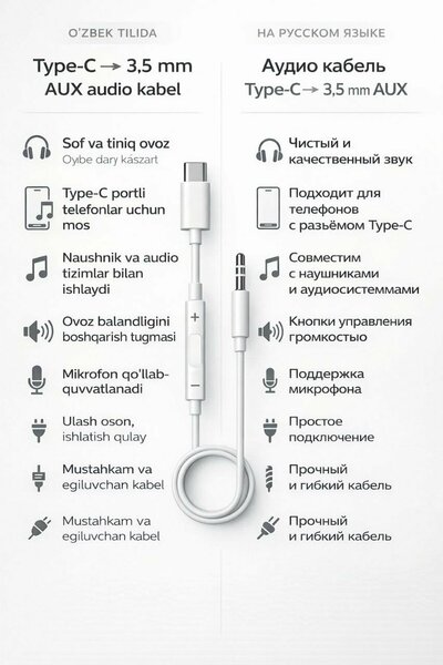 {"widgets":{"@card/DeliveryConsole":{"/content/page/fancyPage/defaultPage/deliveryConsole":{"configType":"MAIN_DO","shouldShowDeliveryPointAgitationBanner":true,"urlSlug":"audio-cable-type-c-to-35-aux-jbc-007-audio-cable-lightning-to-35-aux"}}},"meta":{"/content/page/fancyPage/defaultPage/deliveryConsole":{"name":"@card/DeliveryConsole"}},"collections":{"walterUtils":{"isWalterInitialSuccess":true,"isWalterWithoutFallback":true,"isWalterCanary":false},"deliveryConsole":{"12969703346318254442":{"title":"Доставка Маркета","signals":[],"options":[{"title":"Маркет","type":"MARKET","isChecked":true,"transitionId":"tr_17639312243351367371","subtitle":{"date":{"value":"Завтра","features":["THINGRAY"]},"price":{"value":0,"valueFeatures":["THINGRAY"],"currency":"UZS","currencyFeatures":["THINGRAY"]}},"details":[{"title":"","deliveryOptions":[{"id":"6775097114997866494","address":{"addressLine":"Ташкент","addressLineObject":{"abbreviativePart":"Ташкент","isRegion":true,"isTagged":false}},"additionalInfo":"","signals":[{"title":{"content":[{"type":"literal","value":"15-30 мин. курьером в удобный момент"},{"type":"icon","value":"ai_chevron"},{"type":"newline","value":""}],"feature":"PRIMARY"},"analytics":{"type":"onClickSignal","text":"15-30 мин. курьером в удобный момент"},"popupInfoId":"pp_18064787403457921207"}]},{"id":"6775097114997866493","address":{"addressLine":"Ташкент","addressLineObject":{"abbreviativePart":"Ташкент","isRegion":true,"isTagged":false}},"additionalInfo":"","signals":[]}],"signals":[]}],"baobabModel":{"deliveryType":"ON_DEMAND","deliveryDays":1,"priceValue":0,"priceCurrency":"UZS","deliveryDateFrom":"2026-02-23","deliveryDateTo":"2026-02-23","deliveryText":"Завтра, по клику","precise":true,"selected":false,"calculatedFor":"1104c838b83f79c008df7d7a05c6846d;tLqwqXYkV-zgrJgkuc--9A"}}]}},"deliveryInfoOption":{"6775097114997866494":{"dayFrom":1,"dayTo":1,"deliveryType":"onDemand","date":{"value":"Завтра","features":["BOLD"]},"service":{"value":"по клику","features":["THINGRAY"]},"deliveryPrice":{"value":0,"currency":"UZS"},"price":{"value":0,"valueFeatures":["THINGRAY"],"currency":"UZS","currencyFeatures":["THINGRAY"]},"style":"BLUE","baobabModel":{"deliveryType":"ON_DEMAND","deliveryDays":1,"priceValue":0,"priceCurrency":"UZS","deliveryDateFrom":"2026-02-23","deliveryDateTo":"2026-02-23","deliveryText":"Завтра, по клику","precise":true,"selected":false,"calculatedFor":"1104c838b83f79c008df7d7a05c6846d;tLqwqXYkV-zgrJgkuc--9A"},"consoleDate":{"value":"Завтра","features":["THINGRAY"]}},"6775097114997866493":{"dayFrom":1,"dayTo":1,"deliveryType":"pickup","date":{"value":"Завтра","features":["BOLD"]},"service":{"value":"пункт выдачи","features":["THINGRAY"]},"deliveryPrice":{"value":0,"currency":"UZS"},"price":{"value":0,"valueFeatures":["THINGRAY"],"currency":"UZS","currencyFeatures":["THINGRAY"]},"style":"WHITE","baobabModel":{"deliveryType":"PICKUP","deliveryDays":1,"priceValue":0,"priceCurrency":"UZS","deliveryDateFrom":"2026-02-23","deliveryDateTo":"2026-02-23","deliveryText":"Завтра, пункт выдачи","precise":true,"selected":false,"calculatedFor":"4e2fe580b4414153180565c74f847b4b;tLqwqXYkV-zgrJgkuc--9A"},"consoleDate":{"value":"Завтра","features":["THINGRAY"]}}},"urlParams":{}}}