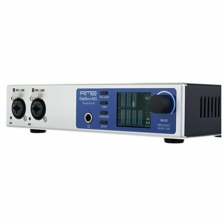 RME Digiface AES – аудиоинтерфейс с питанием от шины USB 2.0 и широкими возможностями цифрового расширения, который дополняет серию Digiface. Девайс с частотой дискретизации до 192 кГц предлагает 14 входов и 16 выходов. Помимо цветного дисплея, функциональных кнопок и регулятора, на передней панели расположены два комбо-входа XLR/TRS и выход на наушники с разъёмом TRS. На задней стороне интерфейса расположены все цифровые входы/выходы, включая AES XLR, ADAT и S/PDIF. Кроме этого, пользователям доступен MIDI-порт mini-DIN (кабель в комплекте) и основные стереовыходы XLR. Digiface AES также может питаться от адаптера постоянного тока 9–15 В. С поставляемым индивидуально переключаемым фантомным питанием 48 В имеющиеся предусилители способны обеспечить усиление до 75 дБ. Также модель имеет такие функции, как удаленное управление через программное обеспечение Total Mix, удаленная совместимость с ARC и DIGICheck, а также фирменная технология SteadyClock FS. Отмечается, что внутренняя память устройства позволяет сохранять шесть разных настроек для вызова различных параметров с помощью кнопки. Характеристики: - Тип: аудио интерфейс - Максимальная частота дискретизации: 192 кГц / 24-бит - Кг+шум линейных входов: -106 дБ (<0.0005 %) - Сигнал/шум линейных входов: 115 дБА - Кг+шум линейных выходов: -110 дБ (0.0003 %) - Динамический диапазон линейных выходов: 123 дБА - Усиление на микрофонных входах: 75 дБ - EIN на микрофонных входах: -129 дБу - Аналоговые входы: 2 x Combo XLR-1/4" 3-Pin Balanced Mic/Line Input - Аналоговые выходы: 2 x XLR 3-Pin Balanced Line Output, 1 x 1/4" TRS Unbalanced Headphone Output - Фантомное питание: 48 В - Цифровые входы: 1 x XLR 3-Pin AES3 Input, 1 x TOSLINK Optical ADAT Input, 1 x RCA Coaxial S/PDIF Input - Цифровые выходы: 1 x XLR 3-Pin AES3 Output, 1 x TOSLINK Optical ADAT Output, 1 x RCA Coaxial S/PDIF Output - Sync I/O: 1 x XLR 3-Pin AES Input, 1 x XLR 3-Pin AES Output - MIDI I/O: 1 x DIN 5-Pin Input (on Breakout Cable) - Подключение к ПК: USB type B - Совместимые ОС: Windows, MacOS - Питание: по шине USB, 3 Вт - Габариты: 215 х 130 х 44 мм - Вес: 880 г