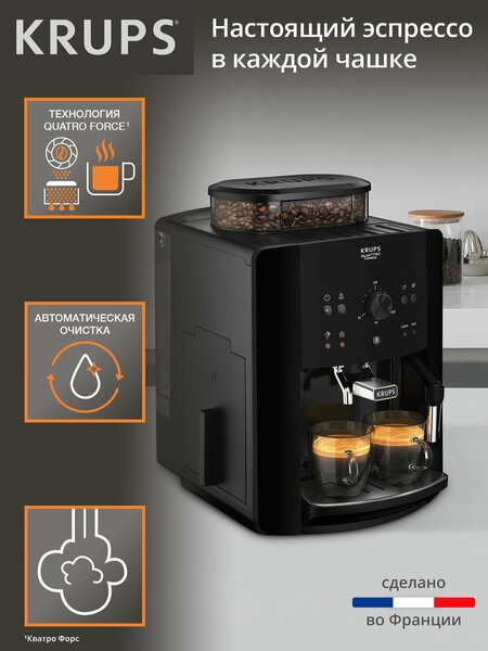 Кофемашина автоматическая Krups Essential EA810870 с LED индикацией, паровое сопло для пены, металлические жернова, черная, Франция
