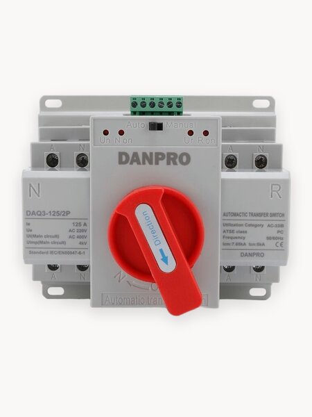 АВР устройство автоматического ввода резерва DANPRO DAQ3-125/2Р используется для автоматического перехода на резервную систему питания в трёхфазных сетях переменного тока с частотой сети 50 Гц номинальным рабочим напряжением 220 ~ 240 В и номинальным рабочим током до 125 А. Для работы на промышленных, коммерческих и жилых объектах.