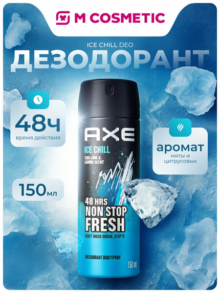 Axe Дезодорант Ice Chill - это эффективное средство для борьбы с неприятными запахами и потом. Продукт представлен в форме спрея объемом 150 мл, что обеспечивает продолжительное использование. Особенностью дезодоранта является его освежающий аромат мяты и цитрусовых, который сопровождается эффектом охлаждения. Это делает его незаменимым помощником в жаркие дни и для активного образа жизни. Способ применения дезодоранта прост и удобен: распылите его на сухую и чистую кожу с расстояния не менее 15 см от тела. Не наносите на поврежденную кожу и прекратите использование при появлении сыпи или раздражения. Состав дезодоранта включает в себя такие активные ингредиенты, как комплекс цинка и витамин E, которые обеспечивают антибактериальную защиту и уход за кожей. Продукт не содержит искусственных красителей, солей алюминия, парабенов, спирта и силиконов, что делает его безопасным для ежедневного использования. Дезодорант Axe Ice Chill не оставляет следов на одежде и подходит для всех типов кожи. Он проверен дерматологами и не тестируется на животных. Время действия дезодоранта составляет 48 часов, что позволяет наслаждаться свежестью и комфортом на протяжении всего дня. Выбирая Axe Дезодорант Ice Chill, вы получаете надежное средство для борьбы с неприятными запахами и потом, которое обеспечивает комфорт и свежесть на протяжении всего дня.