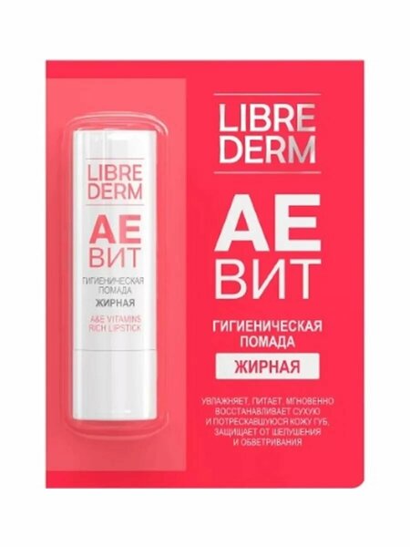 Для сухой и потрескавшейся кожи губ Гигиеническая помада Аевит обогащена витаминами А и Е, обладающими мощными антиоксидантными и регенерирующими свойствами. Увлажняет, питает, мгновенно восстанавливает сухую и потрескавшуюся кожу губ, защищает от шелушения и обветривания. Активные ингредиенты: Витамин А ускоряет процессы заживления, устраняя сухость и шелушение, обладает питательными свойствами. Витамин Е восстанавливает эластичность, защищает нежную кожу губ от неблагоприятного воздействия окружающей среды. Результат кожа губ мягкая, без шелушения. Способ применения: Наносить на губы по мере необходимости.