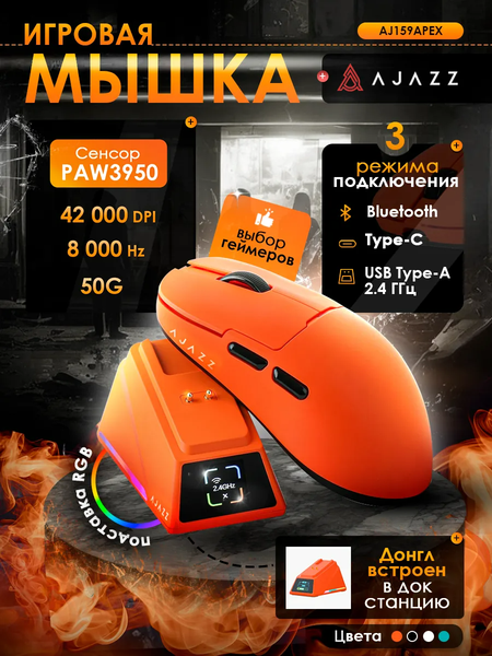 Игровая мышь AJAZZ AJ159APEX с док-станцией — мышь, которая создана для настоящих геймеров. В оснащение модели входит высокотехнологичный сенсор PixArt PAW3950, обеспечивающий идеальную точность, моментальную реакцию и высокую производительность даже в самый напряженный момент игры. Представьте, как классно было бы не только играть за героя вашей любимой игры, но и иметь возможность поставить на экран вашей мышки любое GIF изображение с вашим любимым персонажем. AJAZZ AJ159APEX предоставляет такую возможность с помощью усовершенствованного TFT дисплея последнего поколения. Экран также обладает информационной функцией. Дисплей показывает дату и время, способ подключения, частоту опроса, интенсивность чувствительности DPI, регулировку стоп-вылета LOD. Скачайте ПО на официальном сайте AJAZZ и настройте мышь и TFT дисплей док-станции по своим предпочтениям. Благодаря собственному ПО вы легко сможете регулировать чувствительность мыши DPI, программировать макросы, и подбирать наиболее подходящие для вас световые эффекты RGB подсветки док-станции. Док-станция с RGB подсветкой украсит ваш рабочий стол различными переливами цветов и поможет погрузиться в яркую атмосферу мира гейминга. Отрегулируйте цвет, яркость и направление RGB подсветки с помощью официального ПО AJAZZ. Помимо мыши и док-станции, в комплект также входят антискользящие грипсы, предназначенные для улучшения хвата мыши и снятия нагрузки на кисть во время игры. AJAZZ AJ159APEX совместима с операционными системами Windows и MacOS. Для подключения игровой мыши к компьютеру воспользуйтесь Bluetooth соединением, входящим в комплект кабелем USB Type-C или док-станцией 2.4 ГГц. Магнитное крепление док-станции служит для зарядки игровой мыши и способствует удержанию заряда устройства от 7 и более дней. Благодаря компактному размеру и возможности беспроводного управления, игровая мышь не будет занимать много места на вашем столе и освободит пространство для других устройств, необходимых для гейминга. AJAZZ AJ159APEX — это сочетание исключительной точности, плавного управления, стильного дизайна и высокой производительности, которое станет отличным дополнением к арсеналу любого геймера. Постигайте любые цели, выходите на новые уровни и наслаждайтесь игрой вместе с игровой мышью AJAZZ AJ159APEX.