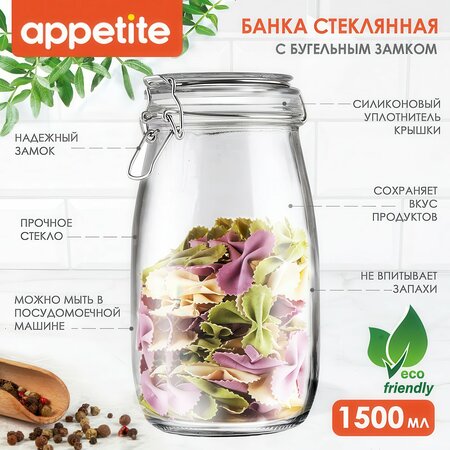 Банка Appetite объемом 1500 мл - это практичное и стильное решение для хранения сыпучих продуктов, специй и бакалеи. Выполненная из стекла, она обеспечивает 100% герметичность и защиту продуктов от влаги и посторонних запахов. Стеклянная крышка с силиконовой прослойкой и бугельным замком плотно закрывается, сохраняя свежесть продуктов дольше. Банка имеет круглую форму и прозрачные стенки, что позволяет легко контролировать содержимое. Банка Appetite подходит для мытья в посудомоечной машине, что облегчает уход за ней. В комплекте с банкой идет стеклянная крышка, которая также может использоваться для хранения других продуктов. Выбирая банку Appetite объемом 1500 мл, вы получаете стильное и функциональное решение для хранения продуктов, которое поможет вам поддерживать порядок на кухне и наслаждаться свежими и ароматными продуктами.