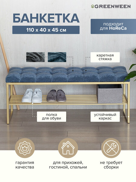 Банкетка в прихожую RUBY с основанием золотого цвета и мягкой велюровой подушкой с каретной стяжкой — это стильное и удобное дополнение к любому интерьеру. Сочетание золотого металлического основания и бархатистой велюровой обивки создает элегантный и изысканный вид. Размеры банкетки с сиденьем (1100 х 400 х 450 мм) позволяют использовать ее как дополнительное сиденье в гостиной, спальне, прихожей или кабинете. Мягкая велюровая подушка обеспечивает комфортное сидение, а высота подушки в 80 мм делает банкетку удобной даже для длительного использования. Наполнитель из пенополиуретана обеспечивает долговечность и сохранение формы подушки. Банкетка RUBY имеет максимальную нагрузку до 120 кг, что делает ее надежным и прочным предметом мебели. Основание из стали с полимерным покрытием обеспечивает стабильность и долгий срок службы. Эта банкетка отличается не только стильным дизайном, но и практичностью: ее можно использовать и как пуфик в прихожую, на котором можно переобуваться, и как место для хранения различных вещей — сумок, перчаток. Бархатистая ткань легко чистится от загрязнений, что делает уход за банкеткой простым и удобным. Банкетка RUBY идеально впишется в любой интерьер, добавив изысканности и уюта. Она отлично сочетается со стеллажами SOHO, создавая гармоничное и стильное пространство. Банкетку доставляют в собранном виде в надежной упаковке, что обеспечивает сохранность и целостность товара во время транспортировки. Фабрика Greenween обладает самым современным высокоточным оборудованием, что гарантирует качество на всех этапах производства и, как следствие, эстетику и надежность всех элементов мебели и декора. Каркас банкетки, несмотря на внешнюю простоту, имеет ряд конструктивных ноу-хау благодаря нашим инженерным разработкам и лазерному раскрою трубы, что выражается в высочайшем качестве и эстетике сварных швов, подчеркивающих элегантность данной модели.