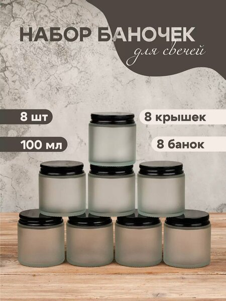 Представляем вам набор стеклянных баночек с крышками, созданный для того, чтобы дарить радость создания свечей своими руками. Набор для создания свечей включает в себя 8 прозрачных матовых баночек 100мл с черными крышками. Стеклянная банка с крышкой — это идеальная форма для свечей, которая может стать как ярким акцентом, так и деликатным дополнением к домашнему уюту. Каждая баночка подобрана с заботой о качестве и функциональности. Мини баночки наполнят интерьер лёгкостью. Данные формы помогут воплотить в жизнь свои самые смелые идеи в творчестве и рукоделии. Банка для свечи станет эксклюзивным предметом набора для творчества рукоделие. Наш набор для создания свечей — это не просто инструменты, это вход в роскошный мир свечеварения, где каждый может стать создателем эксклюзивного произведения искусства. Форма для свечей позволит делиться вашей креативностью, вашей уникальной историей. Наши маленькие банки с крышкой также отлично подойдут в качестве органайзера для рукоделия.