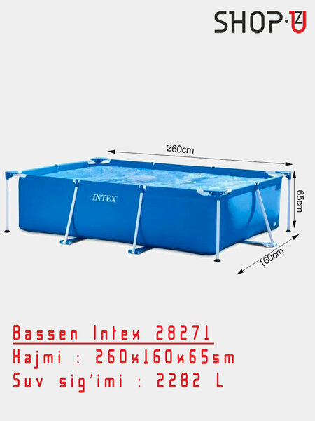 Бассейны предлагаются с объёмами от 880 до 17203 литров Бассейны INTEX каркасной серии Frame представляют собой сборный каркас и оболочку из прочного материала, изготовленного по технологии Super-Touch (сочетание винила с полиэстером), придающей стенкам бассейна повышенную прочность Перед установкой бассейна убедитесь, что поверхность, на которую он будет установлен, абсолютно ровная и чистая Достаточно быстро и легко устанавливаются без использования какого-либо инструмента Сборный бассейн серии Rectangular Frame. Стальной каркас выдерживает большие нагрузки, так что в нем одновременно могут купаться несколько человек. Запатентованная технология SUPER-TOUGH обеспечивает надежность бассейну. Cтенки изготовлены из трех слоев: два слоя плотного винила и один — полиэстер для особой прочности. Не требует подготовки грунта и насыпки песка. Все, что нужно — это плоская горизонтальная площадка. Процесс сборки бассейна занимает 30-45 минут (до наполнения водой). Есть сливной клапан, который присоединяется к садовому шлангу. Воду из бассейна можно слить в любое удобное место