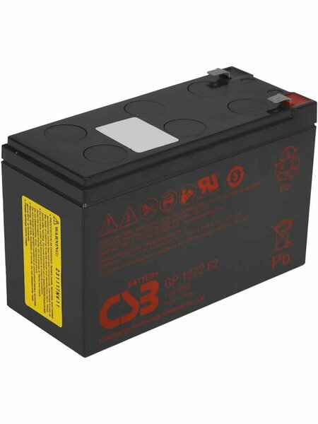 CSB Батарея GP1272 12V (7.2 Ah) F2 (28W)). Товар оригинальный и новый. Официальная Гарантия по России. Надежная упаковка заказа. Батарея для ИБП CSB GP1272F2, 12V/28W представляет собой аккумулятор общего назначения. С его помощью можно обеспечить резервным питанием различные промышленные объекты и системы безопасности. Срок службы батареи составляет 5 лет резервного использования либо 260 циклов при полной разрядке в постоянном режиме работы. Основными достоинствами этого аккумулятора являются низкий уровень саморазряда, высокая эффективность и удобство в обслуживании. Батарея для ИБП CSB GP1272F2, 12V/28W обладает массой в 2.1 килограмма и подойдет в качестве переносного зарядного устройства. Номинальное напряжение каждого из 6 блоков аккумулятора составляет 12 В, а максимальный ток разряда в течение 5 сек - 100 А. Для подсоединения источника питания используются клеммы F1 / F2 - Faston Tab 187/250. Надежность и эффективность в использовании делают эту батарею привлекательным вариантом для покупки.