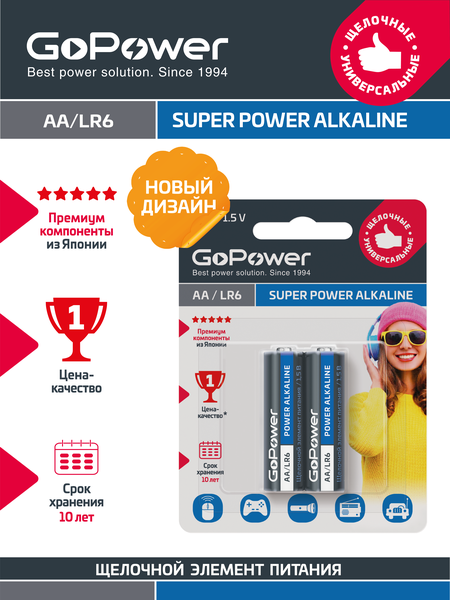 Батарейки GoPower LR6 AA BL2 Alkaline 1.5V Щелочные (пальчиковые) батарейки GoPower серии SUPER POWER ALKALINE универсального назначения, они идеально подходят для большинства современных устройств. Благодаря улучшенной формуле эти элементы питания работают дольше.