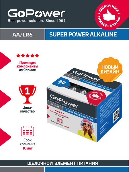 Батарейка GoPower LR6 AA BOX20 Shrink 4 Alkaline 1.5V - 20шт. Щелочные (пальчиковые) батарейки GoPower серии SUPER POWER ALKALINE универсального назначения, они идеально подходят для большинства современных устройств. Благодаря улучшенной формуле эти элементы питания работают дольше.
