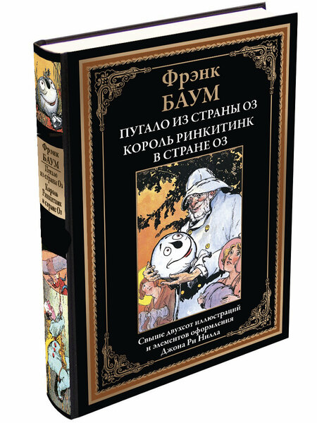 Ознакомиться со всей книгой в электронном виде можно на сайте сзкэо Подарочное иллюстрированное издание отпечатано на отечественной матовой мелованной бумаге Омела с закладкой ляссе одного цвета с капталом. Фрэнк Баум Пугало из страны Оз Король Ринкитинк в стране Оз Свыше двухсот двадцати иллюстраций и элементов оформления Джона Ри НиллаБМЛ Том 322 Лаймен Фрэнк Баум (1856–1919) — американский писатель, создавший целый цикл повестей о волшебной стране Оз. В данном издании представлены девятая и десятая книги этого цикла: «Пугало из страны Оз» и «Король Ринкитинк в стране Оз». В них читатель снова встретит полюбившихся героев и познакомится с новыми обитателями этой волшебной страны. Перевод текстов на русский язык выполнил Сергей Юрьевич Афонькин. Воочию увидеть необычных существ, населяющих диковинную страну Оз, читателям помогут очаровательные иллюстрации американского художника Джона Ри Нилла (1877–1943). Лаймен Фрэнк Баум (1856–1919) — американский писатель, поэт и драматург, автор знаменитой серии книг о стране Оз. За свою жизнь он написал несколько десятков различных произведений, а также пробовал себя в роли актера, драматурга, торговца и редактора журналов. Наиболее успешным его детищем стал цикл повестей о чудесной стране Оз. Первая книга серии («Удивительный волшебник из страны Оз») вышла в 1900 году и стала самой продаваемой детской книгой в США. Вскоре история о девочке Дороти, соломенном Пугале, Железном Дровосеке и Трусливом Льве покорила весь мир. Четыре года спустя Баум написал продолжение — оно тоже было благосклонно принято публикой. В результате из-под пера Баума вышло четырнадцать книг, посвященных приключениям в стране Оз. Экранизации и театральные постановки по мотивам путешествий маленькой Дороти начались еще при жизни Баума, а его книги и в наши дни переиздаются многочисленными тиражами и переводятся на разные языки мира. В данном издании представлены девятая и десятая части серии. В «Пугале из страны Оз» (1915) капитан Билл и девочка Трот объединяются с Орком и полюбившимся читателям Пугалом. Побывав в Прокляндии, они свергают жестокого короля Злоба, заморозившего сердце принцессы Глории. Книга «Король Ринкитинк в стране Оз» (1916) была посвящена новорожденному внуку Баума. Она повествует о принце Ингваре с острова Пингари. Вместе с королем Ринкитинком он путешествует по волшебным островам, чтобы спасти пингарийцев и своих родителей от злобных захватчиков. Издание украшают очаровательные рисунки американского художника Джона Ри Нилла; именно он первым проиллюстрировал чудесные истории о волшебной стране Оз. Джон Ри Нилл (1877–1943) известен как иллюстратор книг для детей. Его творческий путь начался рано: уже в старших классах Джон рисовал для школьной газеты. Позже Нилл начал сотрудничать с периодическими изданиями: он занимался рисованием комиксов, а также иллюстрировал рассказы для детей. В 1904 году рисунки Нилла украсили первое издание второй книги Баума о стране Оз — «Чудесная страна Оз». С тех пор Нилл иллюстрировал каждую книгу этого цикла, и даже те повести, которые были написаны другими авторами уже после смерти Баума. Более того, художник и сам сочинил несколько повестей о стране Оз. Его иллюстрации, выразительные и динамичные, великолепно передают характеры персонажей и облик волшебной страны, п