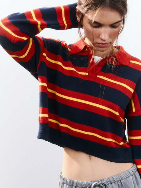 - Короткий женский джемпер-поло прямого кроя из мягкой ткани тонкой вязки на основе вискозы - V-образный вырез горловины на пуговицах с отложным воротником-поло. Длинные свободные рукава с прямыми манжетами и спущенной линией плеча. Прямой нижний край без разрезов - Трендовый джемпер-поло в полоску для женственных, стильных и привлекательных аутфитов на учебу, в офис и просто на каждый день. Универсальный и практичный вязаный джемпер будет отлично сочетаться с любым низом. Поло подойдет для создания образов «офисной сирены», городского шика и смарт-кэжуал. Носи его в повседневных образах с удобным низом или в составе многослойных образов. Заверши аутфит удобной обувью и стильными аксессуарами из новой осенней коллекции Befree - Размер на модели: S