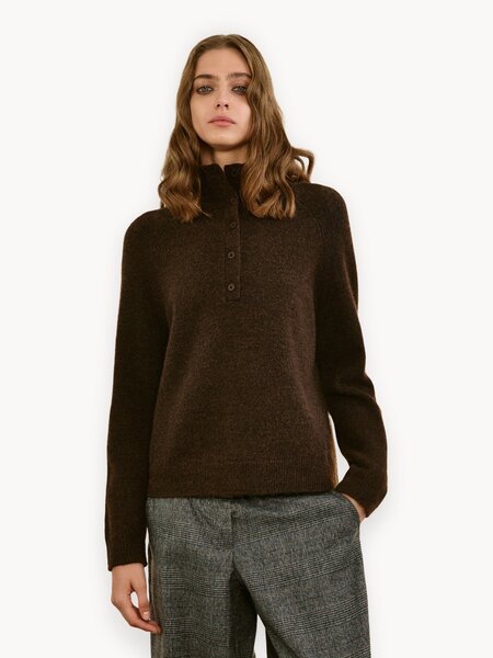 - Вязаный женский джемпер свободного кроя из мягкой ткани толстой вязки с добавлением натуральной шерсти - Высокий воротник-стойка на пуговицах, который при желании можно носить как отложной воротничок с V-образным вырезом. Длинные рукава-реглан с прямыми манжетами в рубчик. Прямой нижний край в рубчик без разрезов и декоративных элементов - Мягкий и удобный вязаный свитер в актуальных осенних расветках идеально подойдет к повседневным аутфитам на учебу, в офис и для прогулок в прохладную осеннюю погоду. Джемпер на пуговицах из новой коллекции будет уместно смотреться и в строгих офисных, и в расслабленных кэжуал-образах. Носи джемпер с трикотажными брюками из новой коллекции Befree, чтобы создать актуальный и теплый вязаный комплект - Размер на модели: S