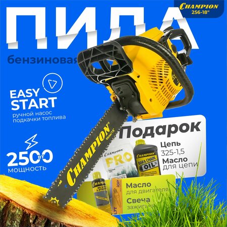 Бензопила Champion 256-18"-0,325-1,5-72 A256-18 + подарочный набор относится к полупрофессиональному классу. Оснащена автоматической системой подачи масла на шину и цепь. Благодаря ручному насосу для подкачки топлива не возникнет трудностей при запуске инструмента после длительного перерыва. Для повышения безопасности в данной модели имеется механический инерционный тормоз. Преимущества Champion 256 A256-18: Инерционный тормоз цепи и уловитель цепи - безопасность оператора Блокировка курка газа - защита от повторного пуска Воздушное охлаждение двигателя Облегченный доступ к воздушному фильтру Регулируемая автоматическая система подачи масла на цепь и шину Эргономичная рукоятка Champion 256-18"-0,325-1,5-72 A256-18 + подарочный набор Топливо: смесь бензина АИ-92 и масла для двухтактных двигателей в соотношении 50:1