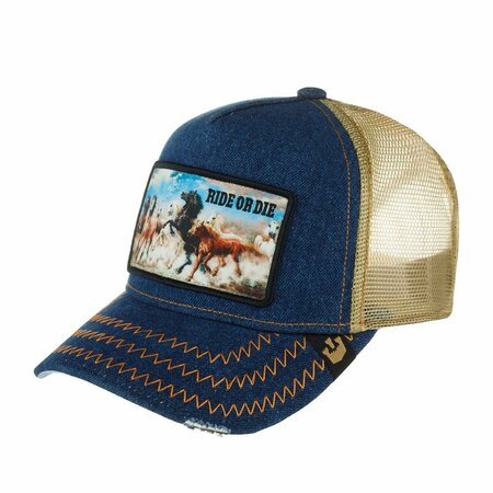 Эффектная бейсболка с тонкой шелковистой сеточкой из коллекции Rodeo от культового американского бренда Goorin. Передняя твердая панель и внешняя часть козырька выполнены из синего денима. Спереди - брендированная медная кнопка и патч в стилистике ретро-фотографии с изображением табуна лошадей и надпись Ride or die, эту фразу используют в значении «идти до конца». На козырьке - дизайнерские прорези и зигзагообразные строчки, его изнанка выполнена из гладкой ткани с принтом с изображением пустынного пейзажа и надписью с датой основания бренда - 1895 год. Размер бейсболки регулируется с помощью светло-желтой пластиковой застежки. Внутри для комфортной посадки по окружности головы предусмотрена мягкая трикотажная лента. Изнанка передней панели обшита гладкой светло-коричневой тканью. Длина козырька – 6 см, глубина – 11 см. Создатели бренда в своих коллекциях с 2022 года обновили систему защиты от подделок: текстильный ярлычок у застежки, а также брендированные швы и измененный дизайн фирменной нашивки внутри.