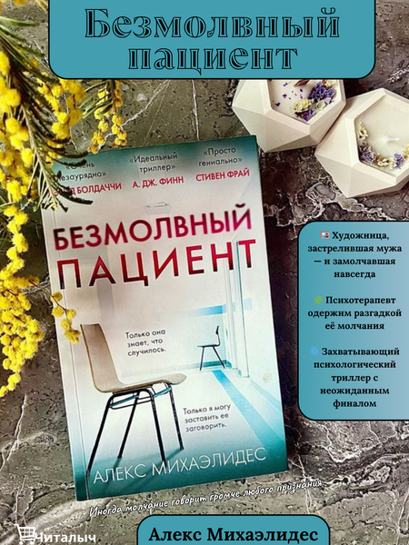 Твердый переплет Жанр: Триллер, психологический роман. Сюжет: История сосредоточена вокруг художницы по имени Алисия Беренсон, которая после убийства своего мужа перестает говорить. Психотерапевт Тео Фабер пытается раскрыть тайну ее молчания и разобраться в происходящем. Персонажи: Главные герои — Алисия Беренсон и Тео Фабер. Их взаимодействие раскрывает сложные и мрачные аспекты человеческой психологии. Тема: Роман затрагивает темы любви, предательства, психического здоровья и борьбы с внутренними демонами. Стиль написания: Книга написана в манере, которая сочетает интригующие элементы, неожиданные повороты и глубокие психологические наблюдения. Награды и признание: Роман получил положительные отзывы и стал популярным во многих странах, заполнив книжные чарты. Завершение: Окончание романа оказалось неожиданным, что вызвало множество обсуждений и интерпретаций среди читателей. Книга Безмолвный пациент, Алекс Михаэлидес«Безмолвный пациент» — это главный триллер 2019 года. Этот дебютный роман, написанный Алексом, издается в 40 странах мира. Он получил восторженные отзывы от известных мастеров жанра, таких как Стивен Фрай, Ли Чайлд, А. Дж. Финн, Дэвид Болдаччи, Блейк Крауч и многих других. Голливуд уже приобрел права на экранизацию за внушительную сумму. В одном из интервью Алекс рассказал о том, как возник замысел его романа: «В моем случае все произошло именно так, как у Тео, главного героя книги. «Настоящая причина, по которой я ввязался в психотерапию, была сугубо эгоистичной. Я хотел помочь самому себе». Решая свои собственные проблемы, я начал интересоваться психотерапией. Я изучал групповые и индивидуальные методики. А позже моя сестра, которая сама является психиатром, устроила меня на неполный рабочий день в отделение для подростков. Это было невероятное событие в моей жизни. Я узнал много нового и интересного. Это был формирующий и изменяющий жизнь опыт». Восторженные рецензии от Стивена Фрая, Ли Чайлда, А. Дж. Финна, Дэвида Болдаччи, Блейка Крауча и многих других. Опыт работы в психиатрическом центре для подростков позволил автору создать убедительную и напряженную историю. Права на экранизацию книги уже приобрела продюсерская компания Брэда Питта Plan B Entertainment. Художницей главную героиню «сделала» Ума Турман, которая вместе с Михаэлидесом работала над фильмом «Аферисты поневоле»Алисия Беренсон — художница, которая ведёт дневник. Для неё это не просто способ выразить свои мысли и чувства, но и способ показать любимому мужу Габриэлю, что их жизнь прекрасна. Мысль о том, чтобы расстроить Габриэля или причинить ему боль, невыносима для Алисии. Однако однажды вечером всё меняется. Алисия пять раз стреляет в лицо Габриэлю и с тех пор не произносит ни слова. Её исповедью становится картина. Автопортрет, в левом нижнем углу которого Алисия пишет одно-единственное слово, написанное по-гречески: «алкеста». Тео - опытный психотерапевт, убеждён, что способен помочь Алисии, несмотря на то, что все остальные специалисты потерпели неудачу. Заинтригованный расследованием её преступления, он осознаёт, что молчание Алисии скрывает гораздо больше, чем кажется на первый взгляд. Однако готов ли Тео принять правду, если Алисия решит заговорить?