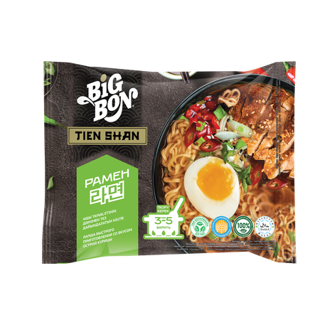 Рамен BIGBON Tien Shan со вкусом острой курицы — это насыщенное блюдо с ароматным бульоном, мягкой лапшой и пряным вкусом специй. В составе натуральные ингредиенты и халяль-сертификат. Идеально подходит для быстрого приготовления горячего, сытного и вкусного блюда всего за 3–5 минут.