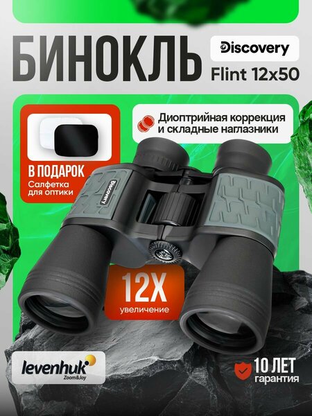Discovery Flint 12x50 – универсальный бинокль с 12-кратным увеличением. Благодаря высокой кратности он идеально подходит для подробного изучения отдельных объектов, удаленных на значительное расстояние. Этот оптический прибор станет прекрасным выбором для охоты, похода или рыбалки. Он надежен, удобен в использовании и передает ясную и четкую картинку по всему полю зрения. Porro-призмы и линзы сделаны из оптического стекла BK-7. Также они дополнены несколькими слоями просветляющего покрытия, которое повышает контраст изображения и позволяет лучше различать мелкие детали объектов при наблюдениях в сумерках. Центральный барабан фокусировки удобно ложится под пальцы, что позволяет без труда настраивать резкость одной рукой. Для более точной настройки оптики можно использовать кольцо на правом окуляре, которое отвечает за регулировку диоптрий. Также можно выставить удобное расстояние между зрачками. Наглазники окуляров можно складывать и раскладывать. Металлический корпус – надежная защита оптических элементов от любых случайных повреждений. Он долговечный и прочный, а также дополнен фактурными боковыми вставками для улучшения захвата. При необходимости бинокль можно устанавливать на стандартный штатив 1/4 дюйма. Основные особенности: