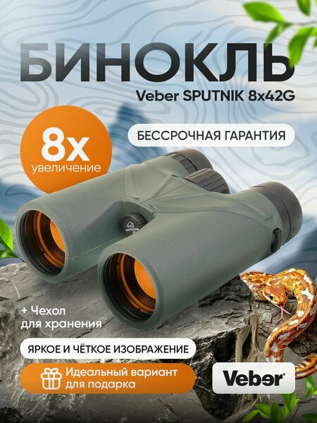 Veber SPUTNIK 8х42G – бинокль с большими объективами – 42 мм и при этом достаточно легкий (525 г), прочный и эргономичный, с которым владелец может не расставаться целый день.