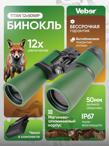Бинокль Veber TITAN 12x50WP, как и все бинокли серии TITAN, сочетает качественную оптику, надежность и эргономику, необходимые для эффективной охоты, безопасного туризма, исследований дикой природы или наблюдений за спортивными соревнованиями. Оптическая система бинокля позволяет вести наблюдения в условиях плохой освещенности, не теряя четкости и яркости изображения. Корпус устройства герметичен и защищает внутренние элементы от попадания пыли и влаги даже во время дождя или снегопада. Обрезиненный корпус из металлического сплава устойчив к ударам. Особенности: Кратность 10х, угловое поле зрения 5,4°. Линейное поле зрения – 95 метров на расстоянии 1000 м. Центральное кольцо фокусировки. Диоптрийная коррекция ±6 дптр. Система призм Porro из стекла BAK-4 Оптика с многослойным антибликовым покрытием FMC. Эргономичный корпус из магниево-алюминиевого сплава. Прорезиненное покрытие уменьшает скольжение. Пылевлагозащита IP67: полная защита от пыли, защита от струй и кратковременного погружения в воду. Резьбовое отверстие 1/4" для установки на трипод. Высококачественная оптическая система Система призм Porro – классическое решение, обеспечивающее биноклям Veber TITAN надежность и эффективность. Такая оптическая система создает объемное, детализированное изображение с максимальной четкостью. Бариевое стекло BAK-4, используемое для призм, уменьшает хроматические аберрации и хорошо пропускает свет. Оптическая система включает 12 линз в объективах и окулярах и имеет многослойное антибликовое покрытие FMC, которое также снижает световые потери и обеспечивает четкую, яркую картинку, высокий контраст даже при слабом освещении, например, в сумерках или в затененном лесу. Азотное наполнение корпуса предотвращает образование конденсата на внутренних поверхностях линз, поэтому изображение остается ясным при перепадах температур и высокой влажности воздуха. Комфортное наблюдение Бинокль имеет постоянное увеличение 10х и угловое поле зрения 5,4°, линейное поле зрения на расстоянии 1000 метров от наблюдателя составляет 95 метров. Центральное кольцо фокусировки позволяет быстро менять наводку на резкость, что особенно важно при наблюдении за движущимися объектами. Минимальная дистанция фокусировки в 7 метров позволяет комфортно наблюдать и ближние цели Диаметр выходного зрачка 4,2 мм позволяет осматривать пространство, не прижимая глаза к окулярам. Складные резиновые наглазники помогают регулировать расстояние от глаз пользователя и делают комфортнее длительное использование прибора. Для людей с особенностями зрения предусмотрена диоптрийная коррекция ±6 дптр на правом окуляре. Надежность конструкции Корпус бинокля Veber TITAN 12x50WP выполнен из прочного магниево-алюминиевого сплава и полностью герметичен, что надежно защищает внутренние части конструкции не только от пыли, но и от влаги. Бинокли TITAN можно использовать во время дождя или снегопада, они выдерживают даже кратковременное (до 30 минут) погружение в воду, на глубину до 1 метра. Внешние части корпуса имеют эргономичную форму, бинокль удобно и надежно лежит в руках. Рельефное резиновое покрытие уменьшает скольжение, позволяя удерживать прибор даже в перчатках. Кроме того, резина смягчает удары и уменьшает риск повредить бинокль при падении. Удобство использования Для длительных наблюдений из статичного 