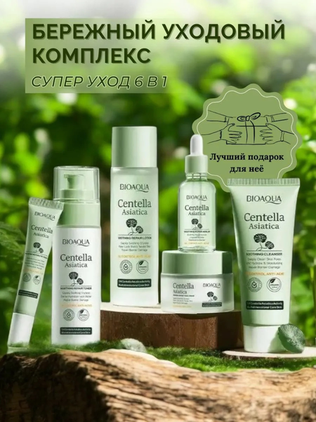 Набор для ухода за лицом BIOAQUA 6 в 1 с центеллой азиатской – это полный комплекс средств для ежедневного профессионального ухода в домашних условиях. • Интенсивное питание и увлажнение кожи • Восстановление после акне и воспалений • Защита от внешних стрессов и сияющий тон лица Главный компонент – Centella Asiatica, известная своими антивоспалительными и регенерирующими свойствами. Она глубоко проникает в кожу, ускоряет обновление клеток, укрепляет защитный барьер и возвращает лицу свежесть, мягкость и здоровое сияние. BIOAQUA – идеальный выбор для тех, кто стремится к ухоженной, ровной и молодой коже каждый день. В наборе 6 тщательно подобранных средств – всё, что нужно для полноценного ухода за кожей лица. Очищающая пенка для умывания Bioaqua — маст-хэв для девушек с чувствительной кожей. Профессиональное средство нежно очищает лицо, снимает воспаления и покраснения. Экстракт центеллы стимулирует регенерацию и обеспечивает успокаивающее действие. Восстанавливает, заживляет повреждения и укрепляет сосуды. Коллаген возвращает эластичность, упругость и красоту кожи, делает лицо сияющим и отдохнувшим. Качественный и натуральный состав продукта подходит для использования в любом возрасте. Комбинированная, жирная, сухая или нормальная кожа — вы будете в восторге после каждого применения. Питательная умывалка обогащена витаминами и полезными веществами, чтобы обеспечить вашему лицу эффективный уход. Увлажняющая пенка гипоаллергенна. Она гораздо бережнее для снятия макияжа, чем лосьон или мицеллярная вода. Предотвращает сухость и шелушения, подготавливает кожу к дальнейшим этапам ухода, усиливает лифтинг-эффект антивозрастных средств. Мягкая густая пена легко наносится и хорошо смывается, не оставляя ощущения липкости. Вам понравится приятный аромат и нежная консистенция. Способ применения: Используйте как начальный этап утренней или вечерней бьюти-рутины. Распределите осветляющую пену по лицу и шее, немного помассируйте кожу. После очищения нанесите антивозрастную сыворотку и увлажняющий крем. Для видимого омолаживающего и подтягивающего эффекта попробуйте комплексный уход от Bioaqua. А если подбираете классный подарок для друзей и близких, то в нашем магазине вы точно найдете подходящую косметику.