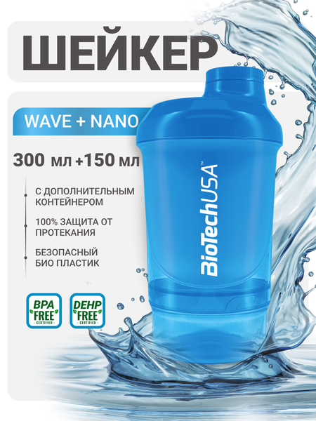 Шейкер WAVE + Nano на 300 мл от BioTechUSA - это универсальная бутылка для воды и шейкер для смешивания спортивных напитков: протеиновых коктейлей, гейнеров, аминокислот, смузи. В комплекте прилагается конусообразное сито для качественного размешивания смеси без комков. Шейкер оснащен специальным отсеком на 150 мл для хранения протеинового порошка и таблеток. Прозрачная мерная шкала помогает рассчитать необходимую порцию или контролировать количество потребляемой жидкости. Изготовлен из высококачественного безопасного пластика по европейским стандартам, не содержит BPA и DEHP. Подходит для использования в микроволновой печи, посудомоечной машине, холодильнике. Плотно прилегающая крышка с резьбой и винтовой колпачок бутылки обеспечивают плотное прилегание и 100%-ую защиту от протеканий.