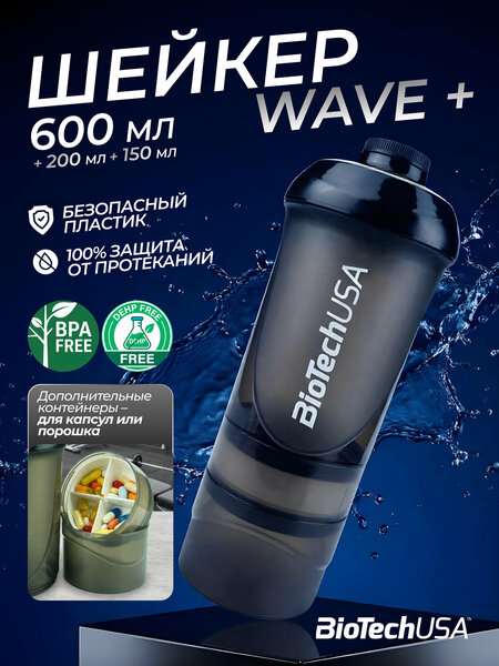 Шейкер WAVE + на 600 мл от BioTechUSA - это универсальная бутылка для воды и шейкер для смешивания спортивных напитков: протеиновых коктейлей, гейнеров, аминокислот, смузи. В комплекте прилагается конусообразное сито для качественного размешивания смеси без комков. Шейкер оснащен специальными отсеками на 200 и 150 мл для хранения протеинового порошка и таблеток. Прозрачная мерная шкала помогает рассчитать необходимую порцию или контролировать количество потребляемой жидкости. Изготовлен из высококачественного безопасного пластика по европейским стандартам, не содержит BPA и DEHP. Подходит для использования в микроволновой печи, посудомоечной машине, холодильнике. Плотно прилегающая крышка с резьбой и винтовой колпачок бутылки обеспечивают плотное прилегание и 100%-ую защиту от протеканий.