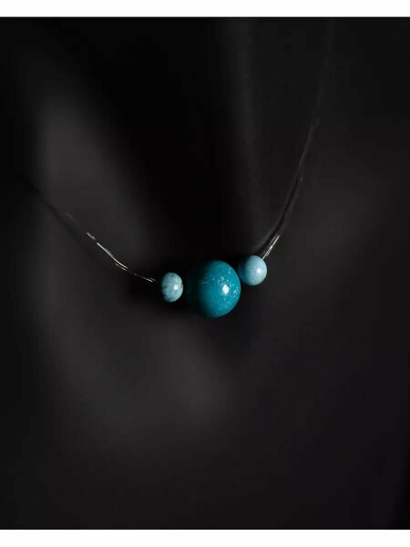Диаметр бусин: 4 мм (2 шт.) и 8 мм (1 шт.) Яркий, характерный цвет бирюзы привлекал людей своей красотой, начиная с глубокой древности. Даже сегодня у этого самоцвета осталось немалое количество почитателей. Аксессуары с этим камнем наполняют энергией и помогают найти гармонию с собой и окружающим миром. Чокер на шею представляет собой стильное украшение. Его главное преимущество – оригинальная неповторимость, ведь наши изделия выпущены ограниченным тиражом — шансы встретить такие же минимальны! Минералы, которые мы используем, отличаются максимальной прочностью и практичностью. Чокер из натуральных камней прослужит вам несколько десятилетий без потери яркости и силы свечения. Качественная леска-резинка не потеряет свою форму даже при регулярном ношении, а прочный замок – карабин, надежно зафиксирует украшение. Колье на леске-резинке не требует особого ухода. Достаточно соблюдать несколько простых правил: избегать контакта с косметикой, бытовой химией, хранить в футляре и регулярно протирать мягкой тканью. Подвеска на леске-резинке дополняет как повседневный, так и вечерний праздничный образ. Вставка из натурального камня подчеркивает индивидуальность и характер обладательницы чокер колье. Украшения на шею с камнем подходят всем в независимости от возраста и сферы деятельности. Чокер невидимка с подвеской из натурального камня, чокер из камней придаст шарм и изысканность. Колье на леске-резинке это элегантный и утонченный аксессуар. Нить с подвеской из камня можно носить как самостоятельное изделие, так и в сочетании с другими колье на шею, с чокером, ожерельем, с кулонами и подвесками, с цепочкой, с бусами, лаконично завершив эффект многослойности, который сейчас в моде. Такой женский кулон на шею на леске-резинке, чокер с камнями, это отличный подарок как памятный сувенир подруге маме жене коллеге сестре дочери любимой девушке и другим вашим близким на Новый год, 14 февраля (День влюбленных), 8 марта, День рождения и просто так, без повода!