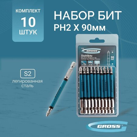 Набор односторонних бит PH2 x 90 мм Gross 11263 — это 10 сменных насадок из стали S2 с крестообразными шлицами и шестигранными хвостовиками 1/4 дюйма, рассчитанные на работу с шуруповертом. Профессиональная оснастка обеспечивает быстрый монтаж и демонтаж резьбовых соединений с углублением PH2. Преимущества Долговечность — насечки на шлице препятствуют проскальзыванию и «слизыванию» бит, дополнительно усиливают контроль при работе с саморезами по дереву. Высокая результативность даже в ограниченном пространстве — благодаря удлиненному профилю 90 мм битами удобно работать в труднодоступных местах. Износоустойчивость — биты изготовлены из японской легированной стали S2 повышенной прочности и закалены до твердости 54-58 HRC. Намагниченный шлиц облегчает работу — крепеж удерживается битой, поэтому свободной рукой можно придерживать закрепляемую поверхность. Антикоррозионные свойства — никелированное покрытие увеличивает срок службы насадок. 10 бит в комплекте — набора хватит на целую бригаду. Удобная упаковка — оснастка поставляется в жестком блистере с европодвесом.