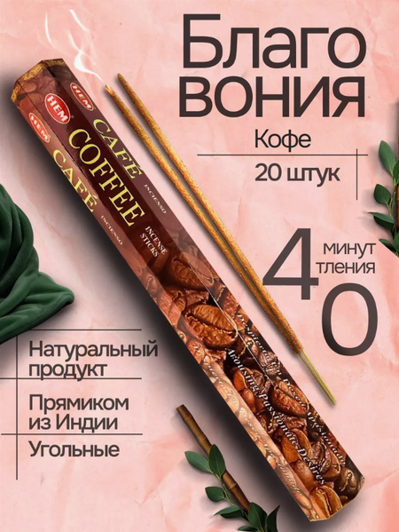 Уважаемые покупатели! Предлагаем вам настоящие индийские благовония HEM — идеальное средство для создания атмосферы уюта и гармонии в вашем доме! Наши аромапалочки являются натуральными и созданы с использованием лучших ингредиентов, чтобы обеспечить вам насыщенный и приятный аромат в каждом уголке помещения. Они идеально подходят для использования как в спальне, так и в гостиной, отлично заполняя пространство нежными и утонченными запахами. Hem Coffee (Кофе) — обладают теплым, горьковатым, бодрящим ароматом свежесваренного кофе, создающим атмосферу уюта и домашнего комфорта. Запах для дома Кофе помогает сбросить нервное напряжение и избавиться от усталости, стимулирует процесс пищеварения, пробуждает аппетит. Улучшают настроение, повышают общий жизненный тонус, также являются хорошим антидепрессантом и легким тонизирующим средством. В течение дня аромат кофе стимулирует активность мозга. Также помогают тем, кто борется с апатией, кому не хватает вдохновения для смелого начала любой деятельности. Натуральные палочки благовония имеют насыщенный, стойкий аромат. Запах для дома остается в воздухе продолжительное время, делая благовония отличным ароматизатором помещений. Имеют разнообразие ароматов, чтобы каждый мог найти идеальный запах для своего дома. Итак, не упускайте возможность погрузиться в мир неповторимых ароматов от HEM. Позвольте им проникнуть в каждую комнату вашего дома и создать атмосферу, полную гармонии, энергии и радости. Приобретайте благовония для дома HEM прямо сейчас и наслаждайтесь незабываемыми ароматами каждый день. В упаковке 20 аромапалочек для дома. Ароматические палочки изготовлены вручную с использованием 100% экологически чистых материалов. способ применения: установите ароматическую палочку на подставку, подожгите кончик аромапалочки, подождите 3-5 секунд, после чего задуйте и оставьте тлеть. Легкого тления хватает примерно на 40 минут. Использовать с осторожностью: людям, склонным к аллергиям, с индивидуальной повышенной чувствительностью, беременным и кормящим женщинам. Хранить в темном месте, при комнатной температуре, далеко от открытого огня. Рекомендуем проветривать помещение после воскуривания благовония. Это поможет ароматам раскрыться и удалить излишки дыма из помещения.