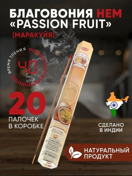 HEM PASSION FRUIT (Маракуйя) - натуральные благовония фруктовой серии. Вы хотите обогатить атмосферу вашего дома приятным ароматом и создать уютную и гармоничную обстановку? Тогда это идеальное решение для вас! Ароматические палочки являются идеальным выбором для тех, кто стремится окружить себя прекрасными ароматами. Hem прекрасно сочетают в себе натуральные и индийские компоненты, создавая волшебную атмосферу и принося множество пользы. Известны своим превосходным качеством, которое подкреплено сотнями положительных отзывов наших клиентов. Наш продукт легко распространяет приятный аромат, наполняя ваш дом чарующими нотками индийской культуры. Наслаждайтесь натуральными ароматическими палочками , которые отличаются длительным сроком горения и превосходным качеством индийского производства. А вы знаете, что ароматические палочки также могут служить идеальным дополнением к домашнему ароматизатору? Просто поместите в арома диффузор и дополните его чарующим ароматом, который будет радовать вас и ваших гостей на протяжении долгих часов. Не откладывайте на потом возможность создать уникальную и гармоничную атмосферу в вашем доме. Приобретайте прямо сейчас и раскройте волшебство индийской культуры в своем интерьере! Обладают ярким и сладким ароматом экзотических фруктов. Благовония фруктовой серии зарядят Вас оптимизмом, уверенностью и радостью. Аромат фруктов способствует повышению самооценки и настроения. Также аромат фруктов улучшает финансовую сферу. Помогает привлечь удачу и везение. Фруктовые аромапалочки благоприятно воскуривать в зоне семьи и дома. Также хорошо их использовать в зоне здоровья. Индийские благовония изготовлены с использованием 100% экологически чистых материалов. Состав: Бамбуковая основа, древесный уголь, композиционная натуральная масляная ароматическая эссенция. способ применения: Поместите палочку в поставку или удерживайте в руке, зафиксируйте и подожгите кончик, держа у основания. Дайте равномерно разгореться - обычно это занимает 20–40 секунд. Затем задуйте. Тлеющую аромапалочку установите в подставку. Длительность тления одной палочки 45 минут. Не применяйте около легковоспламеняющихся предметов. Использовать с осторожностью: людям, склонным к аллергиям, с индивидуальной повышенной чувствительностью, беременным и кормящим женщинам. Хранить в темном месте, при комнатной температуре, далеко от открытого огня. Срок годности не ограничен. Страна производства: Индия.