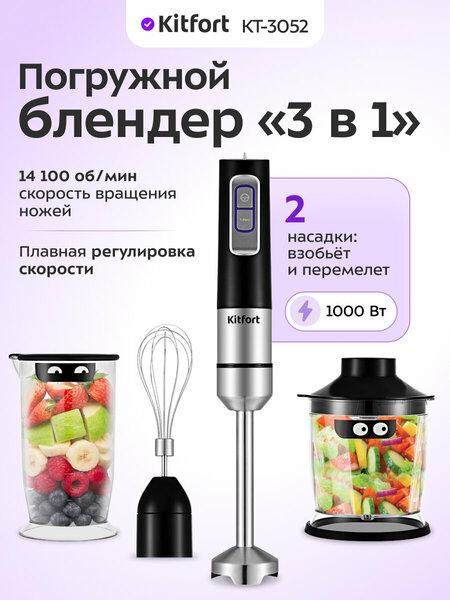 Блендер погружной «3 в 1» Kitfort KT-3052 - это многофункциональное устройство, которое станет незаменимым помощником на вашей кухне. С его помощью вы сможете приготовить разнообразные блюда, от супов-пюре и соусов до молочных коктейлей и детского питания. Устройство предназначено для смешивания, взбивания, гомогенизации, приготовления фруктовых и фитнес-напитков. В комплекте с блендером идут мерный стакан и измельчитель. Максимальная мощность составляет 1000 Вт, что обеспечивает быстрое и качественное выполнение всех операций. Блендер оснащен двумя скоростями и турборежимом, что позволяет регулировать скорость вращения от 13500 до 15000 об/мин. Это позволяет выбрать оптимальный режим для каждого блюда. Корпус блендера выполнен из пластика, а погружная часть - из металла. Это обеспечивает долговечность и надежность устройства. Блендер имеет нескользящие ножки, что обеспечивает устойчивость на поверхности стола. В комплекте с блендером идет мерный стакан емкостью 0.7 л. Это позволяет точно отмерить нужное количество ингредиентов для приготовления блюда. Блендер погружной «3 в 1» Kitfort KT-3052 - это надежный и функциональный помощник на вашей кухне, который позволит вам готовить разнообразные блюда с максимальным комфортом и удовольствием.