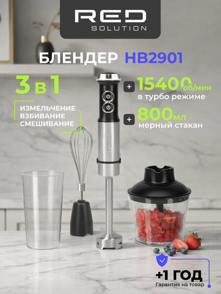 Погружной блендер RED SOLUTION HB2901 — мощный универсальный кухонный прибор, с которым домашняя кулинария выйдет на новый уровень. В комплектацию устройства входят три насадки (блендер, венчик и чаша-измельчитель) и высокий мерный стакан для смешивания. Готовьте соусы, крем-супы, молочные коктейли, измельчайте твердые продукты и меняйте привычную текстуру блюд — все это при помощи одного устройства. 3-в-1 Блендер — острые ножи из нержавеющей стали мгновенно измельчают продукты до однородной консистенции. Готовьте крем-супы, соусы, молочные коктейли и другие блюда, где главное — гладкая равномерная текстура. Венчик — приготовление белков для безе, мусса, воздушного бисквитного теста займет в разы меньше времени, чем при взбивании вручную. Измельчитель — длинные S-образные ножи идеально подходят для быстрой мелкой нарезки овощей, приготовления суповых смесей, основ овощных бульонов и рагу. Также в измельчителе удобно делать ягодные и фруктовые начинки из замороженных и свежих фруктов. Эргономичный дизайн Дизайн ручного блендера предельно строгий и лаконичный: классическое сочетание металла и черного матового пластика, удобные кнопки и рукоятка, интуитивно понятное управление. Плавная регулировка мощности и турборежим Регулятор на верхней части корпуса позволяет постепенно повышать скорость вращения ножей. Турборежим кратковременно повышает скорость до максимальной — это удобно, например, когда нужно разбить комочки или немного изменить текстуру блюда. Двойная защита двигателя Двигатель погружного блендера имеет двойную защиту: в случае риска перегрева и перегрузки устройство отключается автоматически.