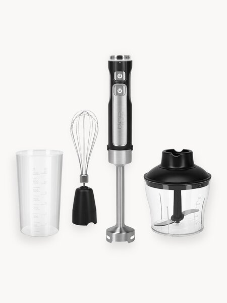 Погружной блендер RED SOLUTION HB2901 — мощный универсальный кухонный прибор, с которым домашняя кулинария выйдет на новый уровень. В комплектацию устройства входят три насадки (блендер, венчик и чаша-измельчитель) и высокий мерный стакан для смешивания. Готовьте соусы, крем-супы, молочные коктейли, измельчайте твердые продукты и меняйте привычную текстуру блюд — все это при помощи одного устройства. 3-в-1 Блендер — острые ножи из нержавеющей стали мгновенно измельчают продукты до однородной консистенции. Готовьте крем-супы, соусы, молочные коктейли и другие блюда, где главное — гладкая равномерная текстура. Венчик — приготовление белков для безе, мусса, воздушного бисквитного теста займет в разы меньше времени, чем при взбивании вручную. Измельчитель — длинные S-образные ножи идеально подходят для быстрой мелкой нарезки овощей, приготовления суповых смесей, основ овощных бульонов и рагу. Также в измельчителе удобно делать ягодные и фруктовые начинки из замороженных и свежих фруктов. Эргономичный дизайн Дизайн ручного блендера предельно строгий и лаконичный: классическое сочетание металла и черного матового пластика, удобные кнопки и рукоятка, интуитивно понятное управление. Плавная регулировка мощности и турборежим Регулятор на верхней части корпуса позволяет постепенно повышать скорость вращения ножей. Турборежим кратковременно повышает скорость до максимальной — это удобно, например, когда нужно разбить комочки или немного изменить текстуру блюда. Двойная защита двигателя Двигатель погружного блендера имеет двойную защиту: в случае риска перегрева и перегрузки устройство отключается автоматически.