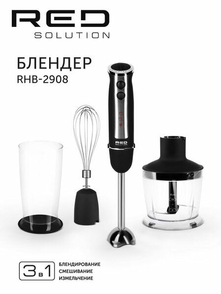 Блендер RHB-2908 от RED SOLUTION - необходимый помощник на вашей кухне Мощность и скорость в ваших руках Если вы ищете многофункциональный блендер для своей кухни, то RHB-2908 - отличный выбор. Благодаря своей мощности в 1200 Вт и нескольким насадкам, это устройство может помочь вам приготовить широкий спектр блюд, включая смузи, коктейли, пюре, супы и многое другое. Погружной блендер RHB-2908 имеет пять скоростей, которые переключаются удобно, легко, а главное - плавно, а также режим “Турбо”. Всё это позволяет настроить устройство под любую задачу. Лаконичный дизайн Компания RED SOLUTION уделяет большое внимание дизайну своих устройств, и блендер RHB-2908 не является исключением. Черный цвет, сочетающийся с металлическими элементами, придает блендеру элегантный и лаконичный вид, который будет дополнять любой интерьер кухни. Надежность и долговечность Прибор оснащен лезвиями из нержавеющей стали, которые легко справятся со всеми видами продуктов и останутся острыми и блестящими максимально долго. Каждый блендер RED SOLUTION оснащен двойной защитой двигателя от перегрева и перегрузки для максимальной безопасности. Это значительно продлевает срок службы устройства. А гарантия на 12 месяцев обеспечит вам дополнительное спокойствие и уверенность в качестве домашнего блендера. Дополнительные насадки Кроме того, блендер для дома RHB-2908 имеет дополнительные насадки: венчик для взбивания измельчитель. Эти насадки делают ручной блендер универсальным и помогают сэкономить место на кухне. Готовить вкусные и здоровые блюда никогда не было так просто. Используйте инновации - переходите на RED SOLUTION!