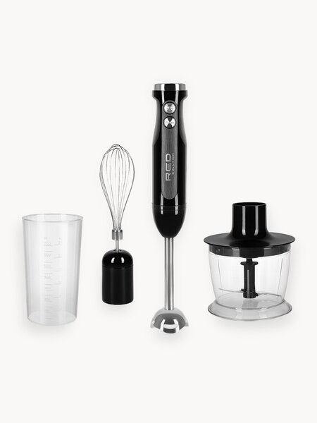 Погружной блендер RED SOLUTION RHB-2987 — универсальный компактный блендер мощностью 800-1200 Вт с набором сменных насадок. В зависимости от выбранной насадки модель может выполнять функцию погружного блендера, миксера и измельчителя. Молочный коктейль, белковая пенка, плотный крем, овощные и фруктовые пюре и другие блюда с однородной текстурой — теперь на вашей кухне. Насадка-блендер Погружную насадку удобно использовать вместе с глубоким стаканом на 700 мм, который идет в комплекте. Острый двухлепестковый нож мгновенно измельчает твердые ингредиенты до однородной консистенции. Венчик Для воздушных десертов предусмотрена насадка-венчик. С ее помощью можно взбить сливки и белки для безе, приготовить мусс и бисквитное тесто. Измельчитель Насадка-измельчитель состоит из S-образного лезвия и контейнера на 500 мл. Идеально подходит для шинковки овощей, зелени, приготовления шоколадной или ореховой крошки и измельчения льда. Турборежим В турборежиме скорость вращения возрастет до 15 000 об/мин. Чтобы избежать неоднородности и комочков, рекомендуется начинать со стандартного режима и в конце переходить на максимальную скорость. Безопасность Двигатель блендера имеет двойную защиту: в случае риска перегрева и перегрузки устройство отключается автоматически, предупреждая поломки и преждевременный износ.