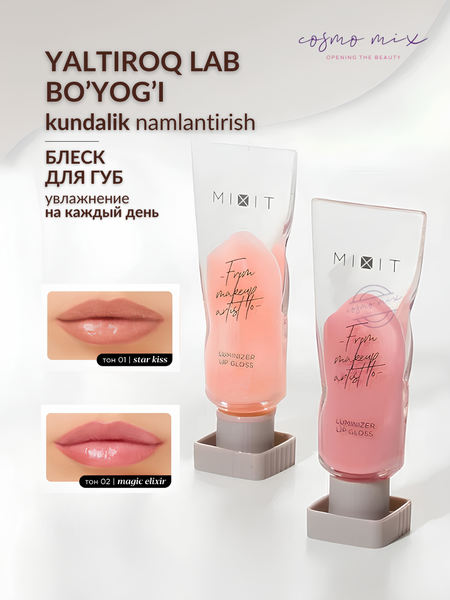 Блеск для губ, 01 — MIXIT Make Up Luminizer Lip Gloss, 5 мл Тип кожи: Для всех типов кожи Потребности: Глянцевый эффект, увлажнение, питание Описание: Блеск для губ создаёт на губах сочный глянцевый финиш без ощущения липкости. Формула на основе ухаживающих масел увлажняет и питает губы, а насыщенные оттенки подчёркивают естественную красоту и придают образу выразительность. Оттенок: Цвета в ассортименте - 01, 02 Как работает: • Увлажняет и питает губы за счёт масел • Придаёт насыщенный глянцевый блеск без липкости • Выражает естественную красоту губ и подчёркивает контур • Лёгкая текстура, комфортное ощущение на губах Результат: Глянцевые, ухоженные губы ✨ Сочный оттенок и эффект сияния Комфортное ощущение и стойкий блеск Для кого: Для тех, кто хочет губы с эффектом глянца, но без липкости и с ухаживающим действием Страна производства: Россия Объём: 5 мл Как применять: Нанесите небольшое количество блеска на чистые губы прямым движением аппликатора. При необходимости можно нанести второй слой для усиления блеска и насыщенности оттенка. Состав (INCI): polybutene, hydrogenated polyisobutene, octyldodecanol, tridecyl trimellitate, polyisobutene, microcrystalline wax, diisostearyl malate, hydrogenated styrene/isoprene copolymer, silica dimethyl silylate, polyglyceryl‑2 triisostearate, synthetic wax, phenoxyethanol, parfum/fragrance, cocos nucifera oil, prunus armeniaca kernel oil, persea gratissima oil, vitis vinifera seed oil, tocopheryl acetate, ethylhexylglycerin, benzyl salicylate, benzyl alcohol, aqua, sodium chloride, BHT, calcium aluminum borosilicate, mica, aluminium hydroxide, sodium sulfate, tin oxide, pentaerythrityl tetra‑di‑t‑butyl hydroxyhydrocinnamate, hexyl cinnamal, hydroxycitronellal, +/- ci 77891, ci 15850, ci 15985, ci 77491, ci 77492, ci 77499.