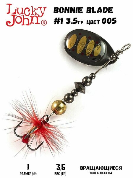 Блесна вращающаяся LUCKY JOHN Original BONNIE BLADE 1/расцветка 005/55мм/3,5гр/лепесток #1 - 22мм BONNIE BLADE 1 - оригинальная вращающаяся блесна с классической овальной формой лепестка. Вращающийся лепесток легок и сделан из латуни, он обладает устойчиво-ровным вращением в воде и позволяют проводить приманку на минимальной скорости. Лепесток "заводится" сразу, как только блесна начинает движение. При вращении угол отклонения лепестка составляет 60 градусов. Лепесток окрашен с двух сторон. На тройнике связана яркая мушка. Длина приманки 55мм. Размер лепестка № 1 (длина 22 мм). Вес 3,5 г. Рыба: окунь, форель, голавль, елец. Bonnie Blade – новая серия вращающихся блесен Lucky John. В этих приманках используются современные конструктивные решения, которые обеспечивают надежную и стабильную игру блесен, и, что самое главное, делают их очень привлекательными для любой хищной рыбы. Главный элемент блесен – вращающийся лепесток. Он очень легок, сделан из латуни и обладает хорошими динамическими показателями при вращении в воде, что позволяет делать проводку приманки на минимальной скорости. Лепесток «заводится» сразу, как только блесна начинает движение. Лепестки окрашены с двух сторон. С какой бы стороны хищная рыба не смотрела на приманку, ее расцветка остается одинаковой и привлекательной, что повышает интерес к блесне и, в итоге, приводит к результативной атаке. Немаловажная деталь – сердечник приманок, от которого зависит вес и дальнобойность приманки, а также ее устойчивость в воде. На всех тройниках связана яркая мушка, основное предназначение которой – снять последние сомнения у приготовившейся к атаке хищной рыбы. Блесна вращающаяся LUCKY JOHN Original BONNIE BLADE №1 005 55 мм 3.5 гр - это высококачественная оснастка для спиннинговой ловли, разработанная известным брендом Lucky John. Блесна обладает широким спектром применения, подходит для ловли различных видов рыб, включая берша, голавля, жереха, речного окуня, ротана, судака, щуку, язя, чехонь и хищные виды рыб. Оснастка оснащена тройным крючком и подвесным крючком, что обеспечивает надежное крепление и удержание рыбы. Тройник связан с яркой мушкой, что дополнительно привлекает внимание рыбы и повышает шансы на успешный улов. Блесна выполнена из металла, что гарантирует ее долговечность и устойчивость к коррозии. Плавучесть блесны - тонущая, что позволяет эффективно использовать ее на разных глубинах. В комплекте поставляется одна блесна, что делает ее удобной для использования как в домашних условиях, так и на рыбалке. Выбирая блесну вращающуюся LUCKY JOHN Original BONNIE BLADE №1 005 55 мм 3.5 гр, вы получаете качественный и надежный инструмент для успешной рыбалки. Данные приманки можно анимировать различные типами проводки : 1. Монотонная равномерная 2. Волнообразная. Это когда блесна ведется с периодическими паузами или сменой скорости проводки. 3. С применением элемента твичинга. Небольшие рывочки при движении или на падении блесны очень нравятся щуке и окуню