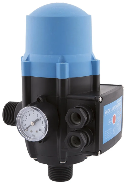 Позволяет автоматизировать работу электронасоса, осуществляя запуск при понижении давления (открытии кранов), или остановку при отсутствии расхода воды в системе (закрытие кранов). Обеспечивает защиту насоса от работы без воды («сухого хода»). Наличие манометра обеспечивает визуальный контроль давления в системе водоснабжения. Возможна настройка стартовой величины включения.